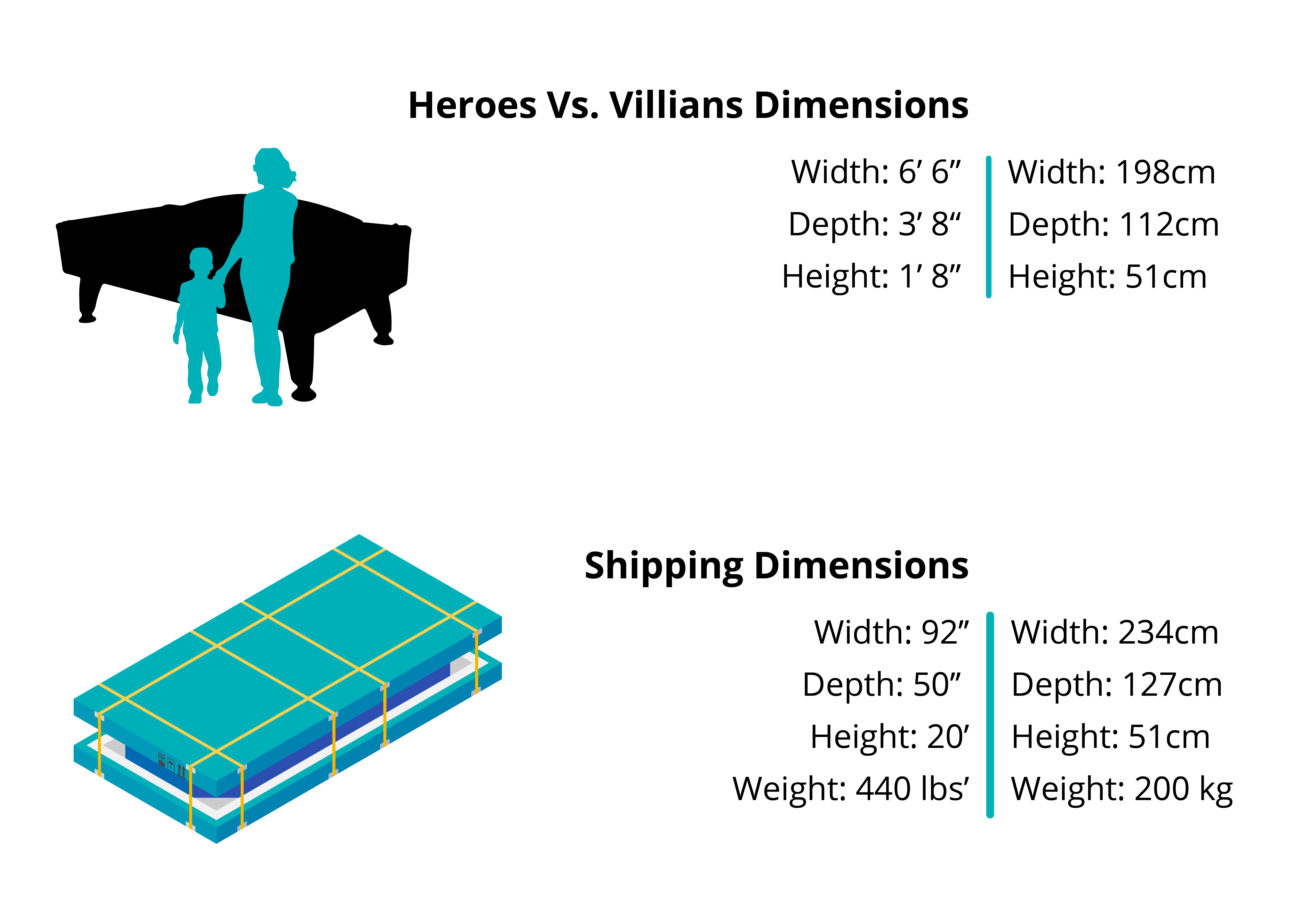 Choose your side, Heroes or Villains? Battle against the other team in this exciting new take on the classic air hockey design! This air hockey table features full motion LED lighting in the playfield, edge rails and in the legs to make this an attractive piece in any game room. The playfield will light up red or blue to let everyone know who has scored. This game also has exciting heroic gameplay music and action sound effects when the puck hits the table edges.
