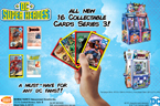 There are 16 collectable trading cards. 7 Hero cards and 7 Villain cards, plus two group bonus cards. The players can trade the cards for tickets or hold them until they collect all 14 Hero and Villain cards for the Super Card Bonus!