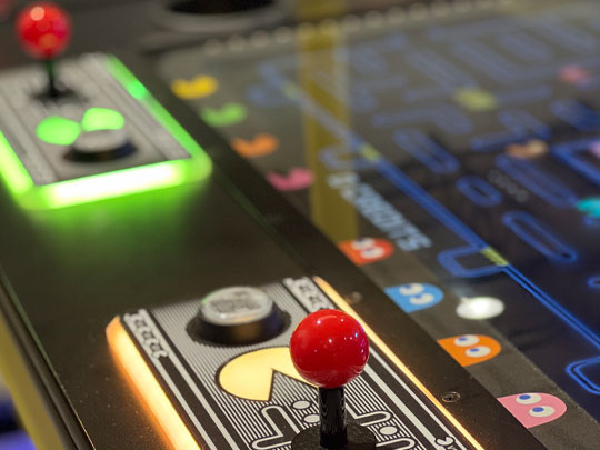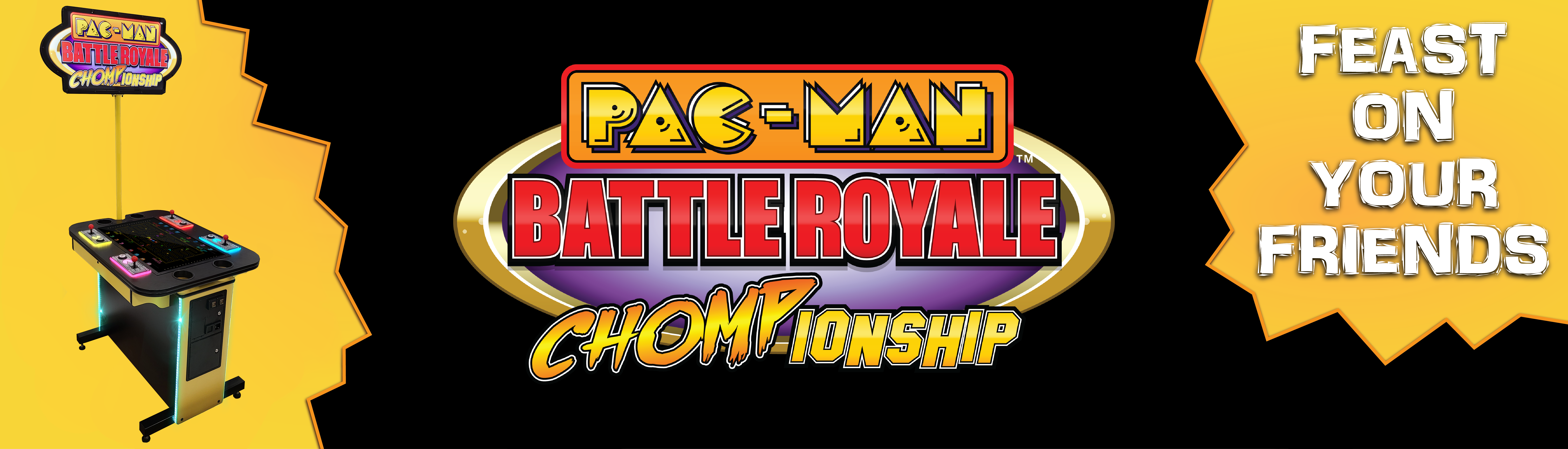 All new 4-player competitive PAC-MAN Battle Royale game. Battle your friends and eat your way to leader of the Pac. Destroy ghosts and other Pac-Man in unique ways with all new power-ups. Connect two cabinets for an 8-player battle! Simple. Fun. Addictive.